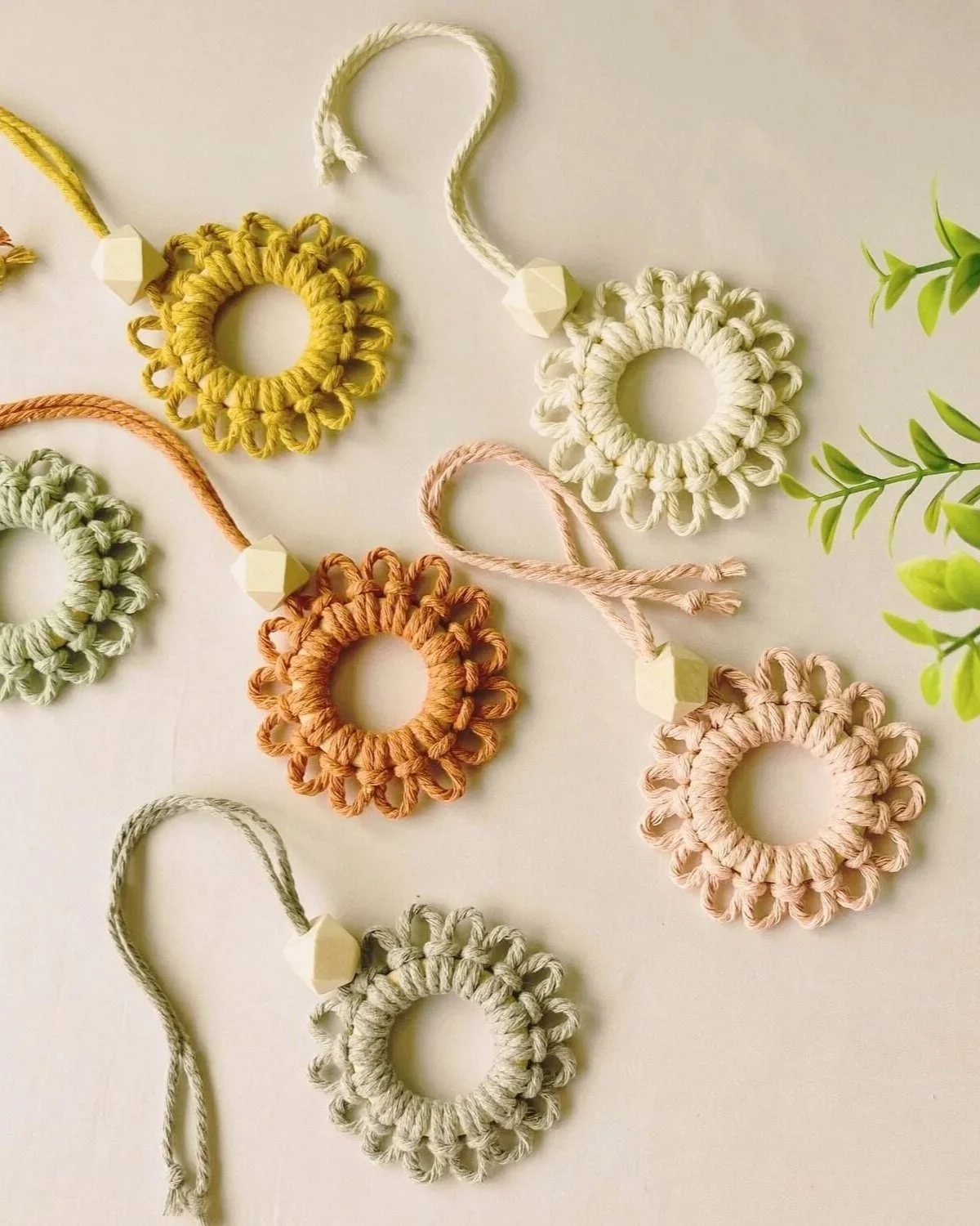 Fold your cords in half, then use Lark’s Head knots to secure them onto the wooden ring.Form the daisy design 🌼